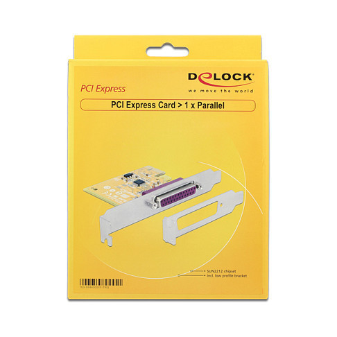 "DeLOCK 89445. Host interface: PCIe, Output interface: Parallel, Expansion card standard: PCIe 2.0. Chipset: SUN2212, Data transfer rate (max): 0.0144 Gbit/s, FIFO (First In, First Out): 16 B. Windows operating systems supported: Windows 10 Education, Windows 10 Education x64, Windows 10 Enterprise, Windows 10 Enterprise x64,.... Package type: Box"\n"The Delock PCI Express card expands a PC by one external parallel port. Different devices such as scanner, printer etc. can be connected to this card. By using the included low profile bracket, the PCI Express card can be also installed into a Mini-PC."