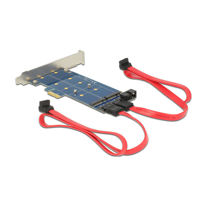 "DeLOCK 89374. Host interface: PCIe, Output interface: SATA, USB 3.2 Gen 1 (3.1 Gen 1). Data transfer rate (max): 6 Gbit/s. Cables included: SATA, USB"\n"The PCI Express card by Delock expands your PC by two M.2 NGFF slots. You can connect up to two M.2 NGFF modules in format 22110, 2280, 2260, 2242 and 2230. Whether you connect a module based on SATA or based on USB you have to connect the SATA connector or the USB connector with your mainboard."
