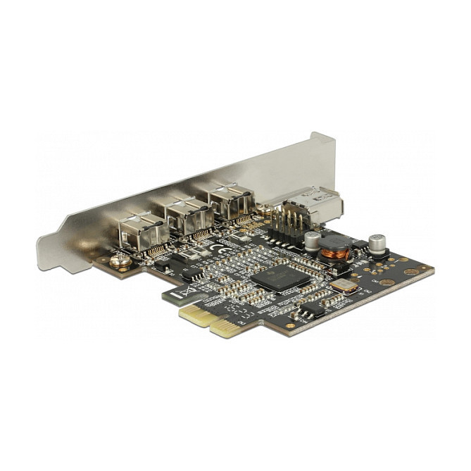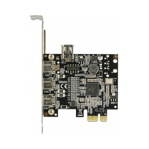 "DeLOCK 89864. Host interface: PCIe, Output interface: IEEE 1394/Firewire. Product colour: Black, Grey, Country of origin: China. Chipset: Texas Instruments, Data transfer rate (max): 0.8 Gbit/s. Package type: Box"\n"This PCI Express card by Delock expands the PC by three external FireWire 800 ports as well as one internal FireWire 400 port. Different FireWire devices such as external enclosure, digital cameras, camcorders, adapters etc. can be connected to this card."