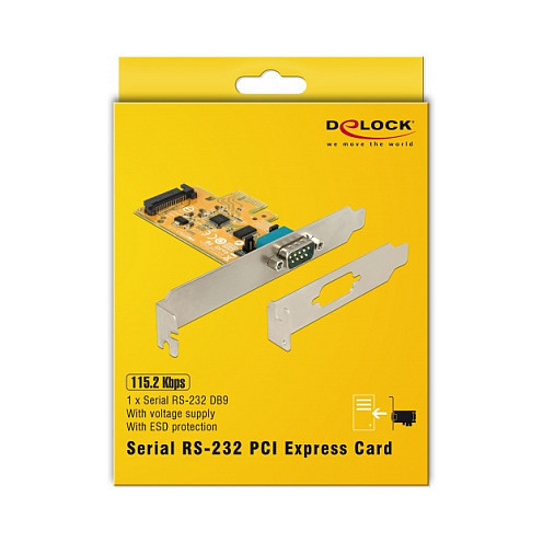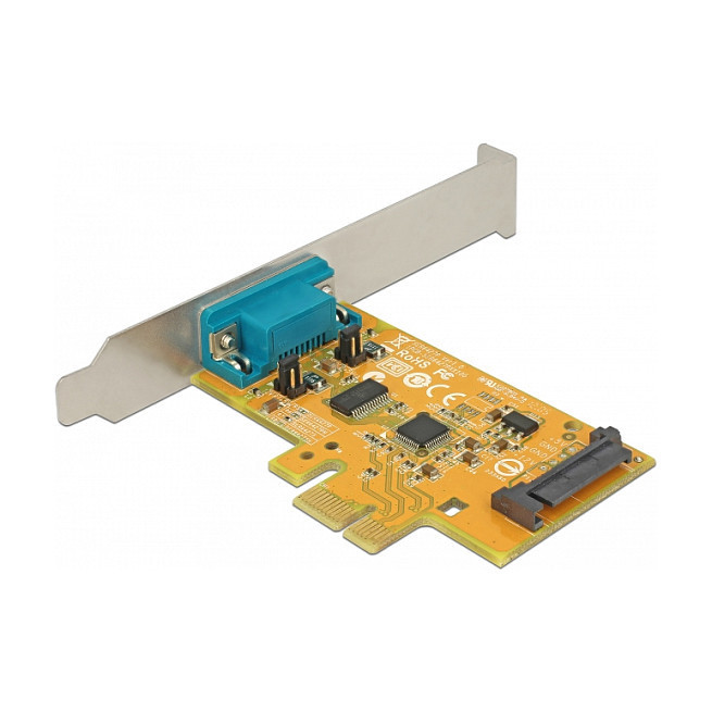 "DeLOCK 90293. Host interface: PCIe, Output interface: RS-232, Expansion card form factor: Low-profile. Chipset: SUN2212, Data transfer rate (max): 0.0001152 Gbit/s, FIFO (First In, First Out): 128 B. Windows operating systems supported: Windows 10, Windows 10 x64, Windows 7, Windows 7 x64, Windows 8.1, Windows 8.1 x64, Server operating systems supported: Windows Server 2008 R2, Windows Server 2012, Windows Server 2012 R2, Windows Server 2016. Package type: Box"\n"The PCI Express card by Delock expands a PC by one external serial port. Connected devices can be optionally supplied with a voltage of 5 V or 12 V. By using the included low profile bracket, the PCI Express card can be also installed into a Mini-PC."