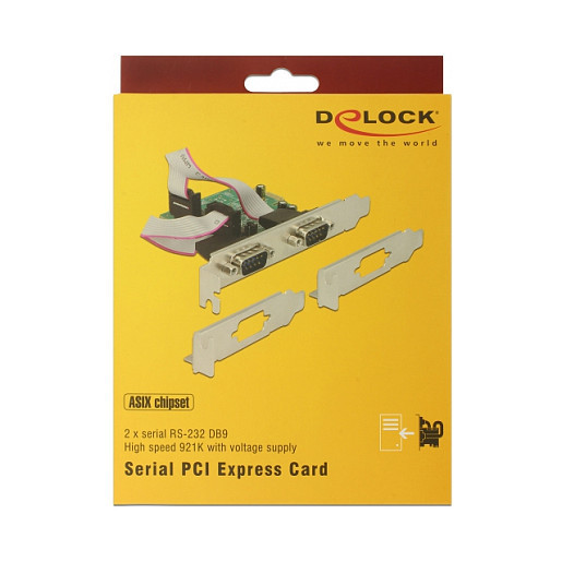 "DeLOCK 89641. Host interface: PCIe, Output interface: Serial, Expansion card form factor: Low-profile. Product colour: Green, Purpose: PC. Data bits: 5, 6, 7, 8, 9, Stop bits: 1, 1.5, 2. Width: 63 mm, Depth: 72 mm, Height: 10 mm"\n"The PCI Express card by Delock expands a PC by two external serial RS-232 ports. Devices such as scanners, protocol converters, POS systems, infrared -, IoT - devices etc. and different modes can be used. By using the included low profile brackets, the PCI Express card can be also installed into a Mini-PC."