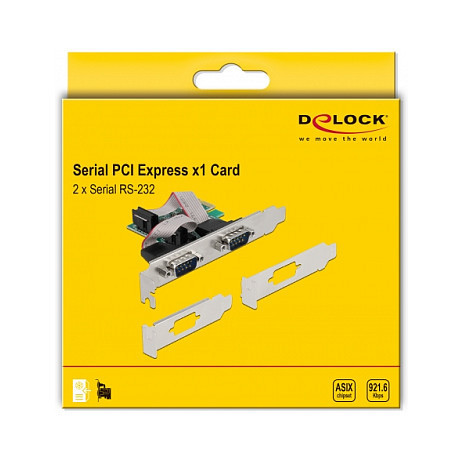 "DeLOCK PCI Express x1 Card to 2 x Serial RS-232. Host interface: PCIe, Output interface: RS-232, Expansion card standard: PCIe 2.0. Purpose: PC, Country of origin: China. Data transfer rate (max): 0.0009216 Gbit/s, FIFO (First In, First Out): 256 B, Data bits: 5, 6, 7, 8, 9. Windows operating systems supported: Windows 10, Windows 8, Windows 8.1. Quantity per pack: 1 pc(s), Package type: Box"\n"The PCI Express card by Delock expands a PC by two external serial ports. Different devices such as scanner, protocol converter, IoT devices etc. can be connected to this card.