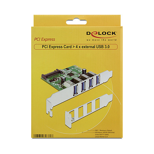 "DeLOCK 89360. Host interface: PCIe, Output interface: USB 3.2 Gen 1 (3.1 Gen 1). Windows operating systems supported: Windows 7 Home Basic, Windows 7 Home Basic x64, Windows 7 Home Premium, Windows 7 Home Premium..."\n"The Delock PCI Express card expands your PC by four external USB 3.0 ports. You can connect USB devices like e.g. docking station, card reader, external enclosure etc. to the card. Due to the vertical direction of the USB 3.0 ports you can also install the card into a low profile slot."