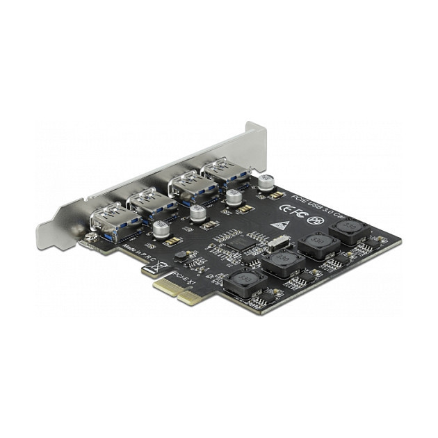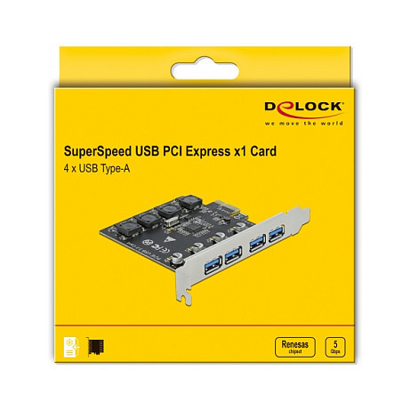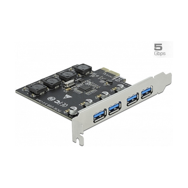 "DeLOCK PCI Express x1 Card to 4 x external USB Type-A female SuperSpeed USB (USB 3.2 Gen 1). Host interface: PCIe, Output interface: USB 3.2 Gen 1 (3.1 Gen 1), Expansion card standard: PCIe 2.0. Country of origin: China. Data transfer rate (max): 5 Gbit/s. Windows operating systems supported: Windows 10, Windows 10 x64, Windows 8, Windows 8.1, Windows 8.1 x64, Linux operating systems supported: Kernel 3.3, Kernel 4.6.4"\n"The PCI Express card by Delock expands a PC by four external USB 3.2 Gen 1 ports. Different USB devices such as docking stations, card reader, external enclosure etc. can be connected.