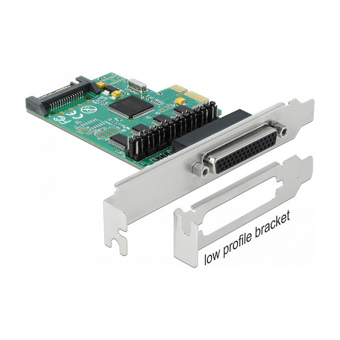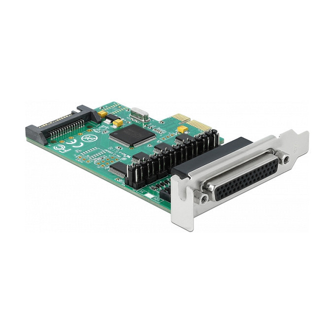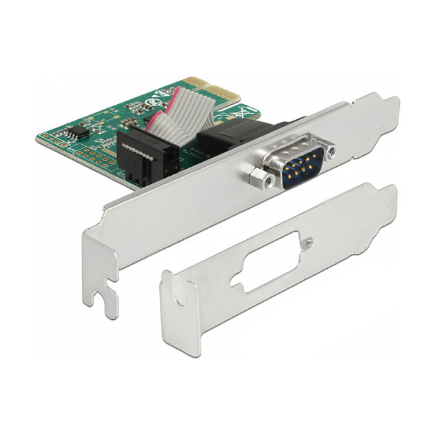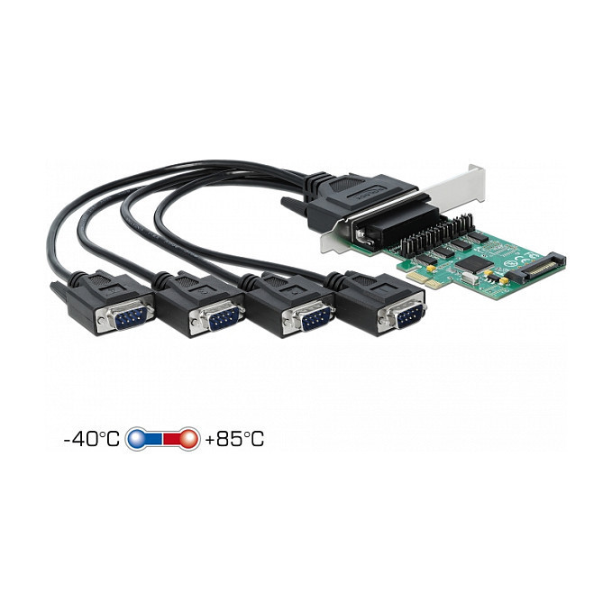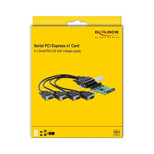 "DeLOCK PCI Express x1 Card to 4 x Serial RS-232 with voltage supply. Host interface: PCIe, Expansion card form factor: Full-height / Low-profile, Expansion card standard: PCIe 1.1. Product colour: Green. Chipset: WCH384L, Baud rate: 230.4 Kbit/s, FIFO (First In, First Out): 256 B. Windows operating systems supported: Windows 10, Windows 7, Windows 8, Windows 8.1. Quantity per pack: 1 pc(s), Cables included: Serial"\n"The PCI Express card by Delock expands a PC by four external serial ports. Connected devices can be optionally supplied with a voltage of 5 V or 12 V.