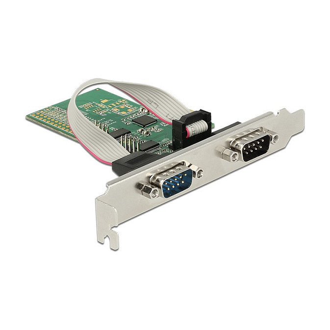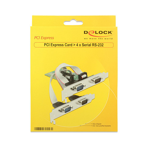 "DeLOCK 89557. Host interface: PCIe, Output interface: Serial, Expansion card form factor: Low-profile. Product colour: Green, Country of origin: China. Chipset: ASIX AX99100, Data transfer rate (max): 0.0002304 Gbit/s, FIFO (First In, First Out): 256 B. Windows operating systems supported: Windows 10 Education, Windows 10 Education x64, Windows 10 Enterprise, Windows 10 Enterprise x64,.... Package type: Hanging box"\n"The PCI Express card by Delock expands a PC by four external serial ports. Different devices such as scanner, printer, mouse etc. can be connected to this card. By using the included low profile brackets, the PCI Express card can be also installed into a Mini-PC."