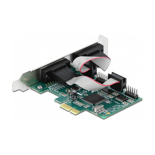 "DeLOCK 90410. Host interface: PCIe, Output interface: RS-232, Expansion card form factor: Low-profile. Product colour: Green, Country of origin: China. Data transfer rate (max): 0.0001152 Gbit/s, FIFO (First In, First Out): 256 B, Data bits: 5, 6, 7, 8. Width: 61 mm, Depth: 82 mm, Height: 16 mm. Quantity per pack: 1 pc(s), Package type: Box"\n