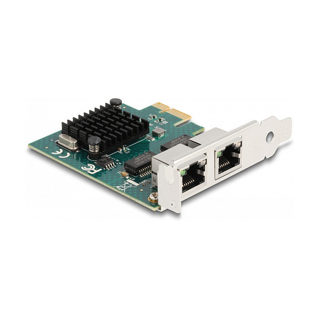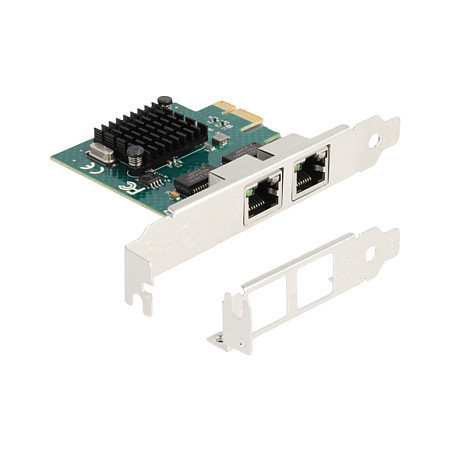 "DeLOCK PCI Express x1 Card to 2 x RJ45 Gigabit LAN BCM. Host interface: PCIe, Output interface: RJ-45, Host interface gender: Female. Product colour: Grey, Purpose: PC, LED indicators: Activity, Link. Data transfer rate (max): 4 Gbit/s. Windows operating systems supported: Windows 10, Windows 10 x64, Windows 11. Quantity per pack: 1 pc(s), Package type: Box"\n"The PCI Express card by Delock offers two network ports with a data transfer rate up to 1000 Mbps.
