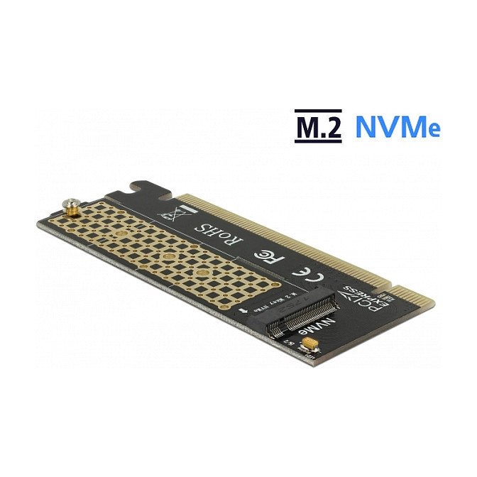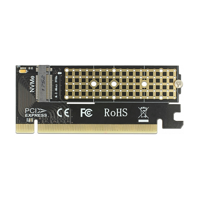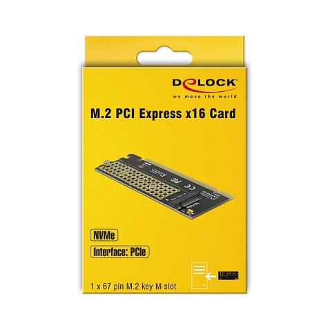 "DeLOCK 90300. Host interface: PCIe, Output interface: M.2, Expansion card standard: PCIe 3.0. Country of origin: China. Windows operating systems supported: Windows 10, Windows 10 x64, Windows 7, Windows 7 x64, Windows 8.1, Windows 8.1 x64, Linux operating systems supported: Kernel 3.17. Width: 98 mm, Depth: 5 mm, Height: 32 mm"\n"This PCI Express card by Delock expands the PC by one M.2 slot. One M.2 module in 2280, 2260, 2242 or 2230 format can be connected. If the card will be installed in the PC, the slot bracket does not have to be removed. Due to the small height, the card can also fit into for servers with one unit height (1U)."