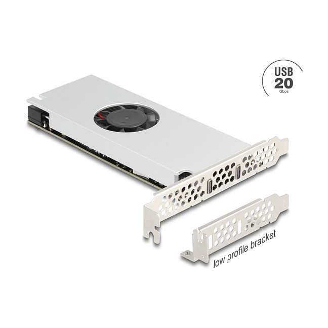 "DeLOCK 90805. Host interface: PCIe, Output interface: USB Type-C, Expansion card form factor: Low-profile. Product colour: Silver, Cooling type: Active, Number of fans: 1 fan(s). Connector 1 gender: Female, Data transfer rate (max): 20 Gbit/s. Windows operating systems supported: Windows 10, Windows 10 x64, Windows 11, Server operating systems supported: Windows Server 2022. Quantity per pack: 1 pc(s), Package type: Box"\n"This PCI Express card by Delock expands the PC by two external USB 20 Gbps ports. Different USB devices such as USB flash memory, card reader, external enclosure etc. can be connected.