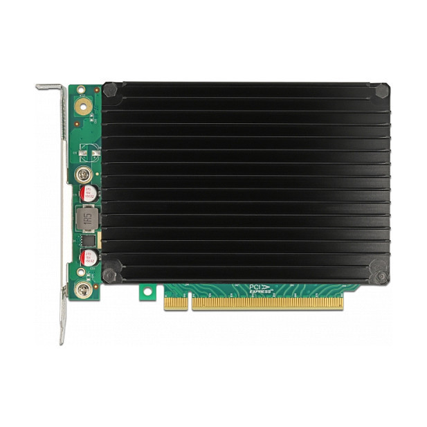 "DeLOCK PCI Express x16 Card to 4 x internal NVMe M.2 Key M with heat sink - Bifurcation. Host interface: PCIe, Output interface: M.2, Expansion card standard: PCIe 4.0. Product colour: Black, Purpose: PC, Cooling type: Passive. Windows operating systems supported: Windows 10, Windows 8.1, Server operating systems supported: Windows Server 2016. Package type: Box"\n"This PCI Express card by Delock expands the PC by four M.2 slots. Up to four M.2 SSDs in format 2280, 2260, 2242 and 2230 can be connected. With the help of the large heat sink sufficient cooling of the M.2 modules is guaranteed.