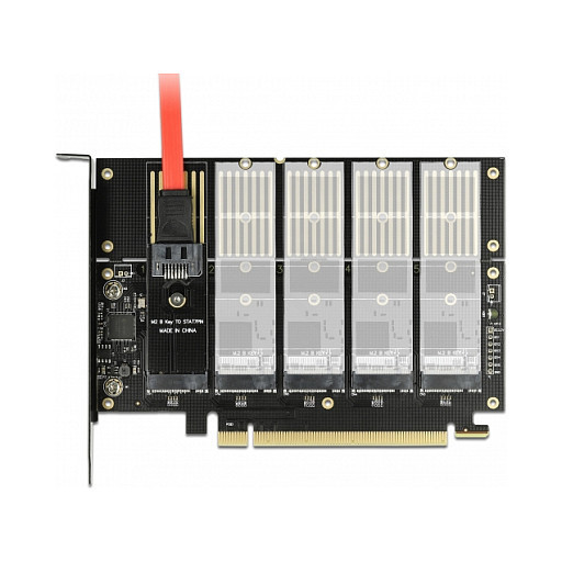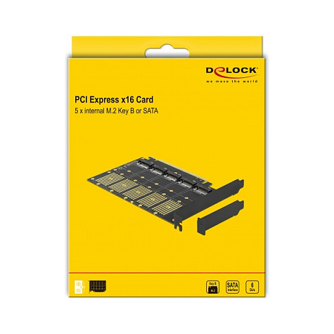 "DeLOCK PCI Express x16 Card to 5 x internal M.2 Key B / SATA. Host interface: PCIe, Output interface: M.2, Expansion card standard: PCIe 3.0. Maximum cable length: 0.5 m, Country of origin: China. Windows operating systems supported: Windows 10, Windows 7, Windows 8.1. Cables included: SATA, Package type: Box"\n"This PCI Express card by Delock expands the PC by five M.2 slots. Up to five M.2 SATA modules can be connected in format 2280, 2260, 2242, 2230 with this card.
