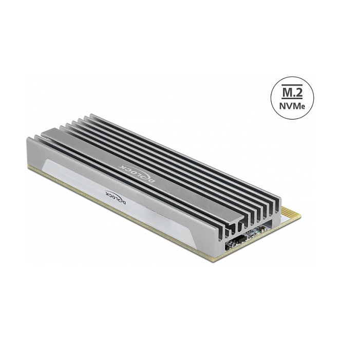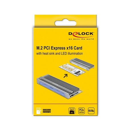 "DeLOCK PCI Express x16 (x4 / x8) Card to 1 x NVMe M.2 Key M with LED illumination. Host interface: PCIe, Output interface: M.2. Product colour: Grey, Cooling type: Passive, Country of origin: China. Width: 44 mm, Depth: 98 mm, Height: 5 mm"\n"This PCI Express card by Delock expands the PC by one M.2 slot. One M.2 module in 2280, 2260, 2242 or 2230 format can be connected. The card can be operated through the notches on an x1, x4, x8 or x16 slot. If the card will be installed in the PC, the slot bracket does not have to be removed.