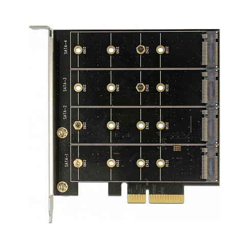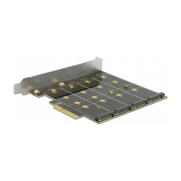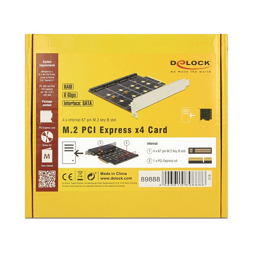 "DeLOCK 89888. Host interface: PCIe, Output interface: SATA, Connector(s): 1 x PCI Express x4, 4 x 67 pin M.2 key B. Country of origin: China. Chipset: Marvell 88SE9230, Data transfer rate (max): 6 Gbit/s, RAID levels: 0, 1, 10. Package type: Box"\n"This PCI Express card by Delock expands the PC by four M.2 slots. Up to four M.2 SATA modules can be connected in format 2280, 2260, 2242, 2230 with this card. When using more than one SSD, there is the possibility to use different RAID level."