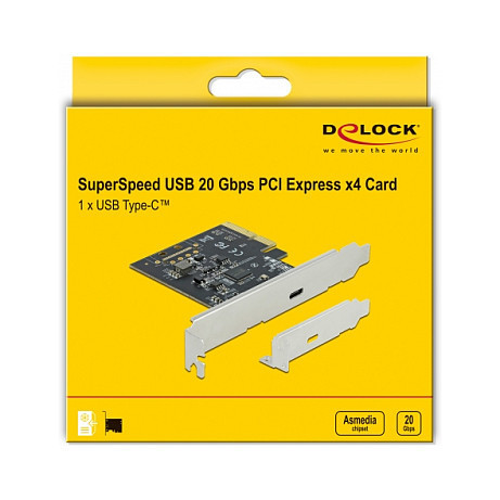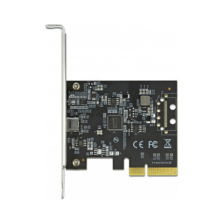 "DeLOCK PCI Express x4 Card to 1 x external SuperSpeed USB 20 Gbps (USB 3.2 Gen 2x2) USB Type-C™ female. Host interface: PCIe, Output interface: PCIe, USB 3.2 Gen 2 (3.1 Gen 2), Expansion card form factor: Low-profile. Product colour: Stainless steel, Purpose: PC. Data transfer rate (max): 20 Gbit/s. Power consumption (typical): 12 W, Output voltage: 5 V, Output current: 2.4 A. Windows operating systems supported: Windows 10, Windows 10 x64, Windows 8.1, Windows 8.1 x64, Linux operating systems supported: Kernel 3.3"\n"Description