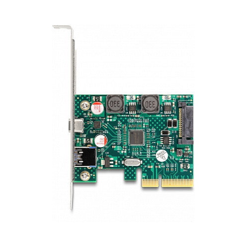 "DeLOCK PCI Express x4 Card to 1 x external USB 10 Gbps Type-C female + 1 x external USB 10 Gbps Type-A female - Low Profile Form Factor. Host interface: PCIe, Output interface: USB 3.2 Gen 2 (3.1 Gen 2), Expansion card form factor: Low-profile. Product colour: Green, Grey, Purpose: PC. Chipset: Asmedia ASM3142, Data transfer rate (max): 10 Gbit/s. Output voltage: 5 V. Quantity per pack: 1 pc(s), Package type: Box"\n"This PCI Express card by Delock expands the PC by two external USB 10 Gbps ports. Different USB devices, such as docking stations, card readers, external enclosures etc., can be connected to the card. The card allows a data transfer rate of 10 Gbps on both ports when used simultaneously."