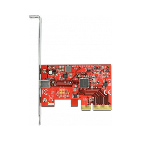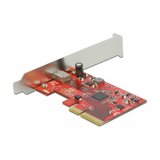 "DeLOCK PCI Express x4 Card to 1 x external SuperSpeed USB 20 Gbps (USB 3.2 Gen 2x2) USB Type-C female - 3 A. Host interface: PCIe, Output interface: USB 3.2 Gen 2, Expansion card form factor: Low-profile. Data transfer rate (max): 20 Gbit/s. Windows operating systems supported: Windows 10, Windows 8.1. Package type: Box"\n"This PCI Express card by Delock expands the PC by one external USB 3.2 port. Different USB devices, such as docking stations, card readers, external enclosures etc., can be connected to the card.