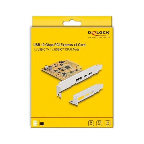"DeLOCK PCI Express x4 Card to 1 x external USB Type-C 10 Gbps female + 1 x external USB Type-C 10 Gbps (DP Alt Mode) female. Host interface: PCIe, Output interface: DisplayPort, USB Type-C, Expansion card standard: PCIe 3.0. Product colour: Metallic, Yellow. Quantity per pack: 1 pc(s), Cables included: DisplayPort, Package type: Box"\n"This PCI Express card by Delock expands the PC by two external USB-C™ ports. Different USB devices such as USB flash memory, card reader, external enclosure etc. can be connected.