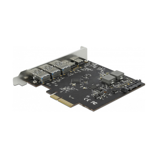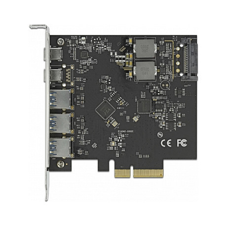 "DeLOCK PCI Express x4 Card to 2 x USB Type-C + 3 x USB Type-A - SuperSpeed USB 10 Gbps. Host interface: PCIe, Output interface: USB 3.2 Gen 2 (3.1 Gen 2), SATA power connector type: SATA 15-pin. Country of origin: China. Data transfer rate (max): 10 Gbit/s. Windows operating systems supported: Windows 10, Server operating systems supported: Windows Server 2016. Package type: Box"\n"This PCI Express card by Delock expands the PC by five external USB 3.2 ports. Different USB devices, such as docking stations, card readers, external enclosures etc., can be connected to the card.