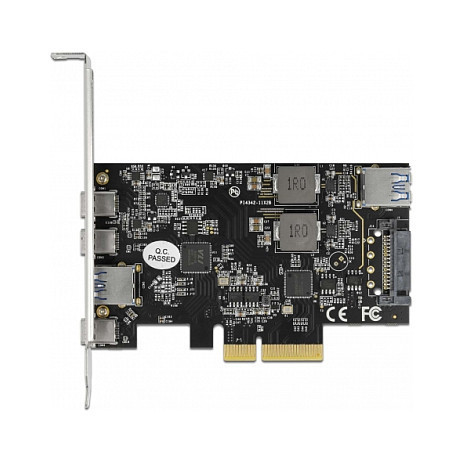 "DeLOCK PCI Express x4 Card to 3 x USB Type-C + 2 x USB Type-A - SuperSpeed USB 10 Gbps - Low Profile Form Factor. Host interface: PCIe, Output interface: USB 3.2 Gen 2 (3.1 Gen 2), Expansion card form factor: Low-profile. Data transfer rate (max): 10 Gbit/s"\n"This PCI Express card by Delock expands the PC by five USB 3.2 ports. Different USB devices, such as docking stations, card readers, external enclosures etc., can be connected to the card.