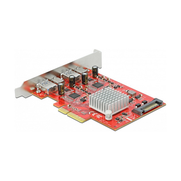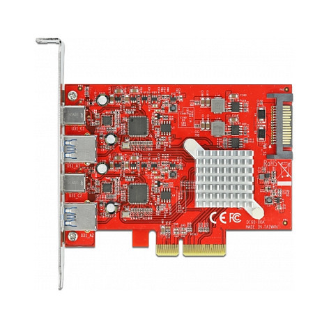 "DeLOCK PCI Express x4 Card to SuperSpeed USB 10 Gbps with 2 x USB Type-A and 2 x USB Type-C - Dual Channel. Host interface: PCIe, Output interface: USB 3.2 Gen 2 (3.1 Gen 2), Expansion card standard: PCIe 3.0. Cooling type: Passive. Data transfer rate (max): 10 Gbit/s. Windows operating systems supported: Windows 10, Windows 8.1. Package type: Box"\n"The PCI Express card by Delock expands the PC by four external USB 3.2 ports, two USB-C and two USB Type-A ports. Different USB devices, such as docking stations, card readers, external enclosures etc., can be connected to the card. The card allows a data transfer rate of 10 Gbps on all ports when used simultaneously.