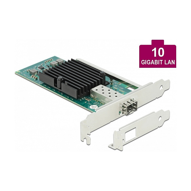 "DeLOCK PCI Express x8 Card 1 x SFP+ 10 Gigabit LAN i82599. Internal. Connectivity technology: Wired, Host interface: PCI Express, Interface: Fiber. Maximum data transfer rate: 10000 Mbit/s. Product colour: Black, Green"\n"This PCI Express network card by Delock provides a connection for an SFP+ module with a transfer rate of 10 Gbps. The SFP slot accepts an optional 10 Gigabit SFP+ module by Delock to connect a PC via a fiber optic cable to the network."