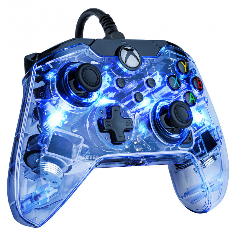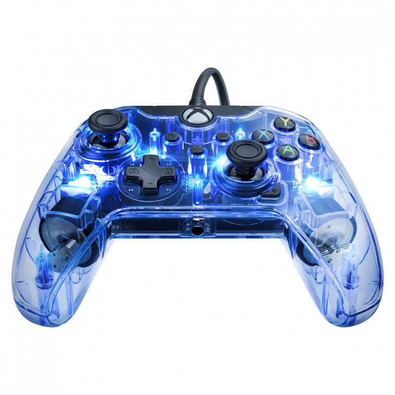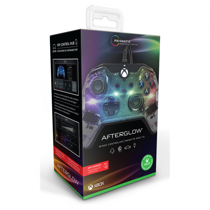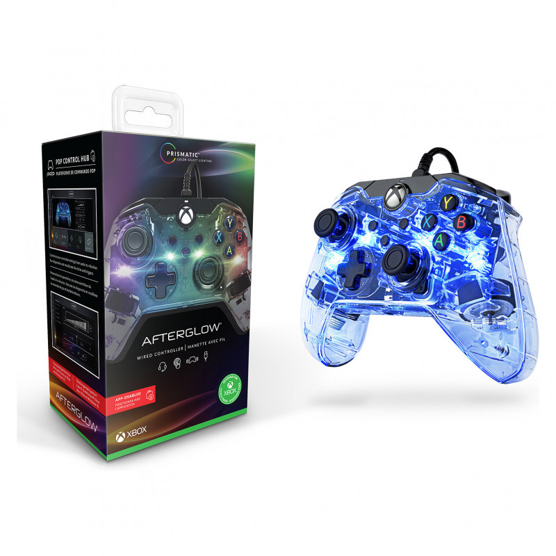 "PDP Afterglow. Device type: Gamepad, Gaming platforms supported: Xbox One, Xbox Series S, Xbox Series X, Gaming control function buttons: D-pad. Connectivity technology: Wired, Device interface: USB. Product colour: Black, Blue, Transparent, Cable length: 2.4 m, Compatibility: Xbox Series X|S. Power source: Cable. Package type: Box"\n"Light up your competition with the Afterglow Wired Controller for Xbox! With our signature Prismatic lighting and four different settings you can change the mode to match your mood.
