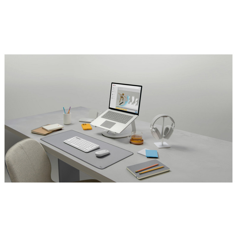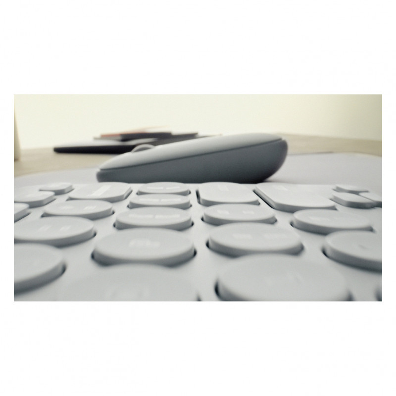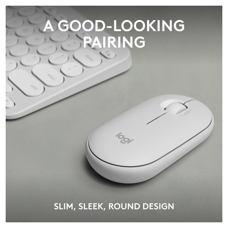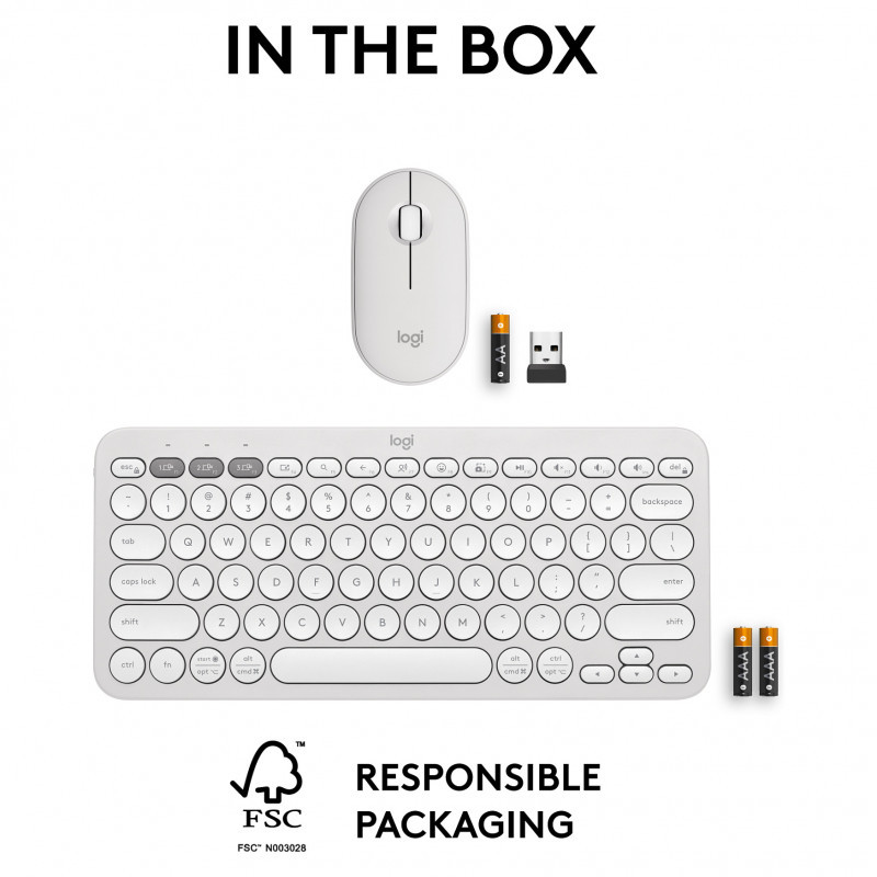 "Logitech 920-012240. Keyboard form factor: Mini. Keyboard style: Straight. Connectivity technology: Wireless, Device interface: RF Wireless + Bluetooth, Keyboard key switch: Scissor key switch, Keyboard layout: QWERTY, Recommended usage: Universal. Product colour: White. Mouse included"\n"HOW YOU EXPRESS YOURSELF IS UP TO YOU