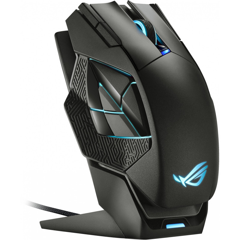 "ASUS ROG Spatha X. Form factor: Right-hand. Movement detection technology: Optical, Device interface: RF Wireless + USB Type-C, Movement resolution: 19000 DPI, Buttons type: Pressed buttons, Buttons quantity: 12, Scroll type: Wheel, Acceleration (max): 50 G. Illumination colour: Multi. Power source: Batteries. Product colour: Black"\n"Wireless gaming mouse with dual-mode connectivity (wired / 2.4 GHz) with magnetic charging stand, 12 programmable buttons, specially tuned ROG 19,000 dpi sensor, Exclusive Push-Fit Switch Sockets, ROG Micro Switches, ROG Paracord and Aura Sync RGB lighting