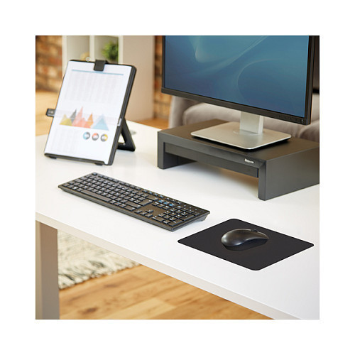 "Fellowes Alfombrilla. Width: 224 mm, Depth: 186 mm. Product colour: Black, Surface coloration: Monochromatic, Material: EVA (Ethylene Vinyl Acetate), Polyester, Non-slip base"\n