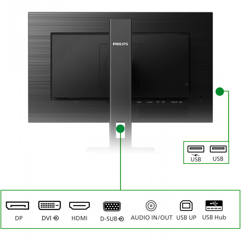 "Philips 242B1G/00. Display diagonal: 60.5 cm (23.8""), Display resolution: 1920 x 1080 pixels, HD type: Full HD, Display technology: LED, Display surface: Matt, Response time: 4 ms, Native aspect ratio: 16:9, Viewing angle, horizontal: 178°, Viewing angle, vertical: 178°. Built-in speaker(s). Built-in USB hub. VESA mounting, Height adjustment. Product colour: Black"\n"The eco-friendly Philips 24"" monitor is designed for sustainable productivity. Super energy efficient design delivers a new level of power savings. PowerSensor and LightSensor further reduce energy use while delivering crisp visuals."