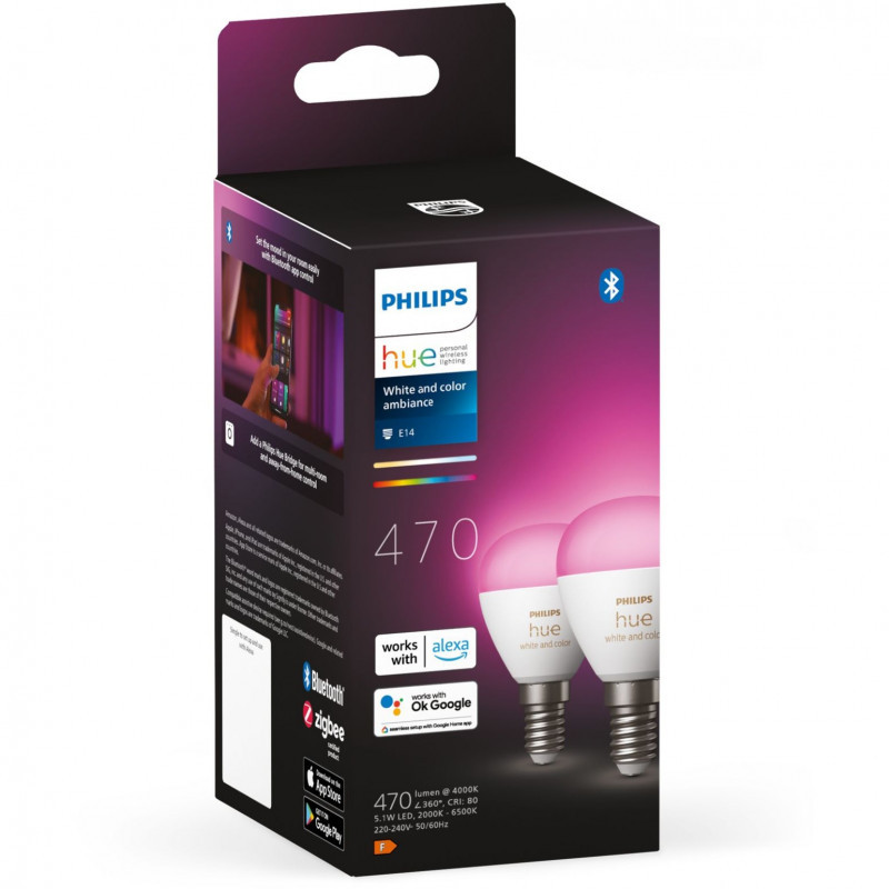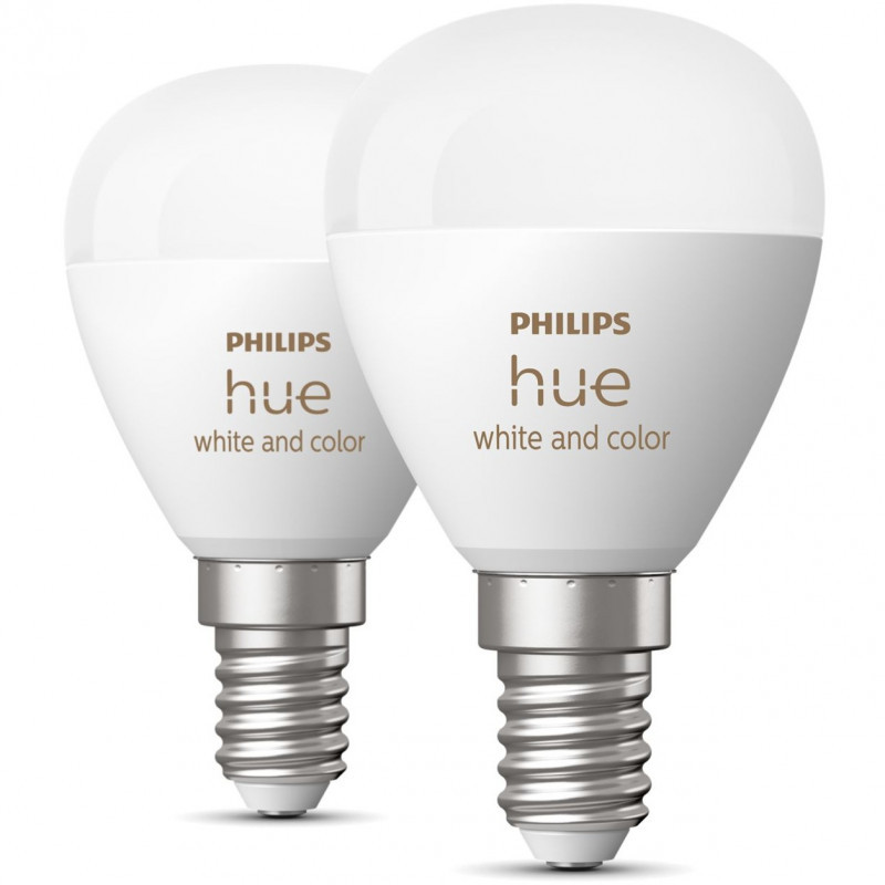 "Philips Hue White and colour ambience Lustre – E14 smart bulb – (2-pack). Type: Smart bulb, Interface: Bluetooth, Product colour: White. Energy efficiency class: F, Power consumption (standby): 0.5 W, Power consumption (max): 5.1 W. Width: 45 mm, Depth: 45 mm, Height: 77 mm. Package width: 72 mm, Package depth: 86 mm, Package height: 174 mm. Quantity per pack: 2 pc(s), Number of hue bulb(s) included: 2 bulb(s)"\n"The Philips Hue lustre P45 E14 bulb lets you integrate your smallest lamps and fixtures into your Philips Hue smart lighting system. About the size of a golf ball, the lustre bulb fits where other, longer E14 bulbs can’t. Available in White, White ambiance, or White and colour ambiance, the lustre bulb brings millions of shades of white and colour light to any area of your home."