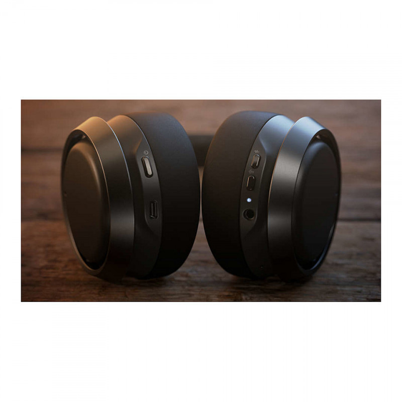The black Muirhead Scottish leather that covers the outer and inner headband is sustainably and ethically sourced. Beautifully soft and textured, this high-performance leather lends a sophisticated touch to the headphones."