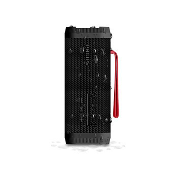 "Philips TAS2000B/00. Driver diameter: 4.8 cm. RMS rated power: 10 W. Connectivity technology: Wired & Wireless, Bluetooth profiles: A2DP, AVRCP, HFP, Bluetooth range: 30 m. Product type: 2.1 portable speaker system, Product colour: Black, International Protection (IP) code: IPX5. Recommended usage: Universal"\n"Get out there with the splash-proof compact speaker that gives you up to 20 hours play time on a single charge. Funky LED lights set the vibe, Bass+ delivers deep bass at any volume and you can connect to other speakers for bigger sound.