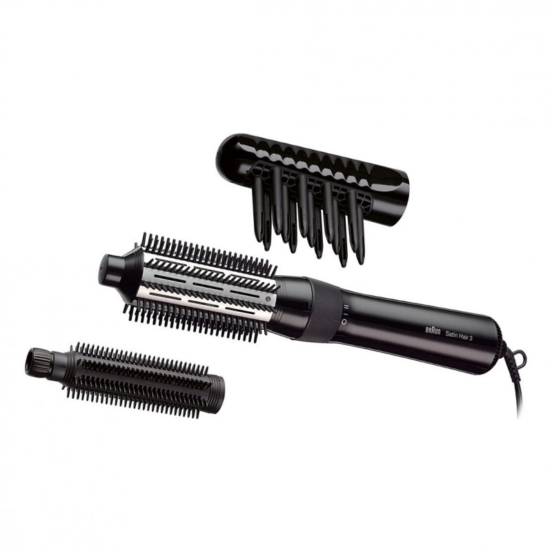 "Braun AS330. Type: Hot air brush, Technology: Warm, Control type: Scrollbar. Product colour: Black. Cord length: 2 m. Power: 400 W, Power source: AC. Cable colour: Black"\n"Braun Satin Hair 3 airstyler. Dry, style & protect with 100% ceramic coating.