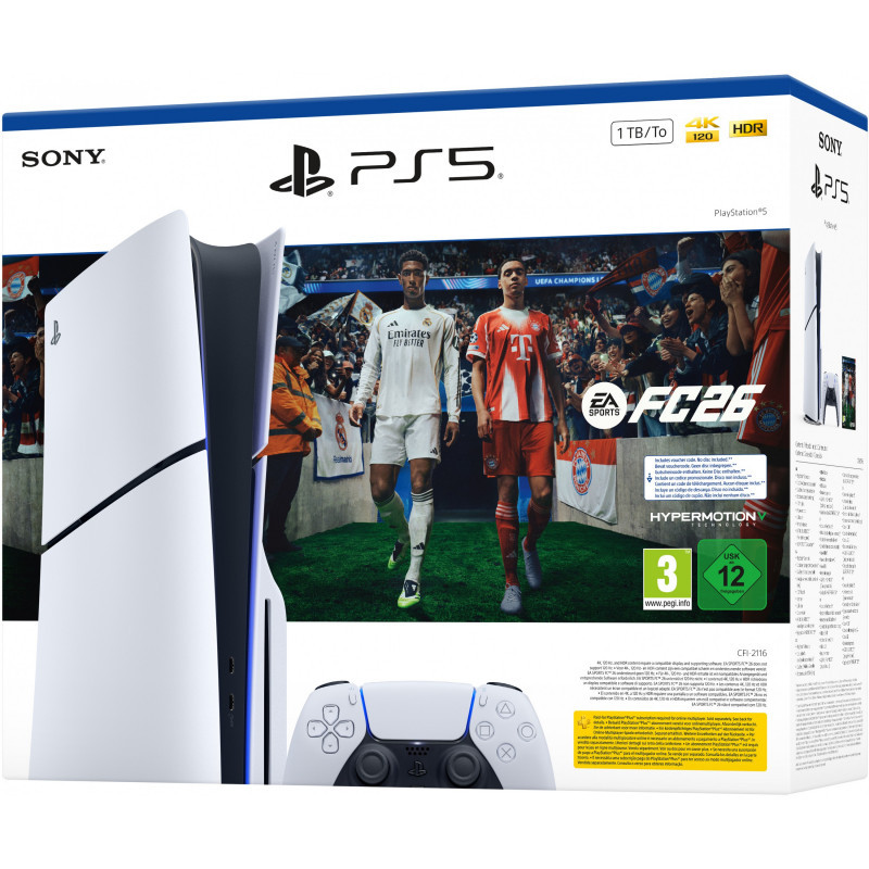 "Sony PlayStation 5 + EA Sports FC 26 Bundle. Platform: PlayStation 5, Product colour: Black, White, Internal memory: 16384 MB. Storage media: SSD, Internal storage capacity: 1 TB, Read speed: 5500 MB/s. Ethernet LAN data rates: 10,100,1000 Mbit/s, Ethernet interface type: Gigabit Ethernet, Wi-Fi standards: 802.11a, 802.11b, 802.11g, Wi-Fi 4 (802.11n), Wi-Fi 5 (802.11ac), Wi-Fi 6 (802.11ax). HD type: 8K Ultra HD. Power source: AC, Power supply: 350 W"\n