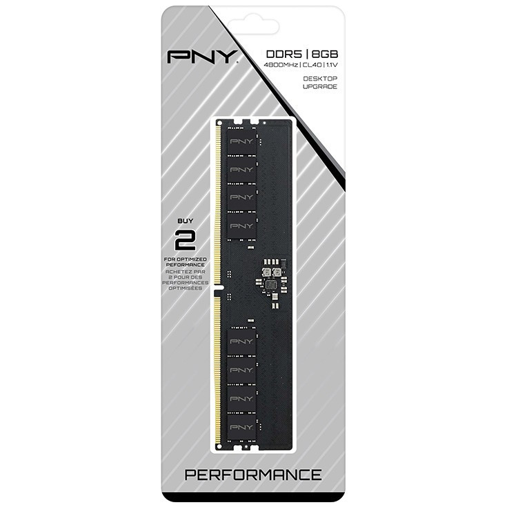 "PNY MD8GSD54800-TB. Component for: PC/Server, Internal memory: 8 GB, Memory layout (modules x size): 1 x 8 GB, Internal memory type: DDR5, Memory clock speed: 4800 MHz, CAS latency: 40, ECC"\n"GET BETTER PC PERFORMANCE WITH A PNY DDR5 PC MEMORY UPGRADE