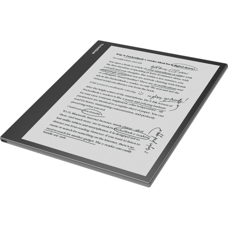 "PocketBook InkPad Eo. Display diagonal: 26.2 cm (10.3""), Technology: E Ink Kaleido, Display resolution: 1860 x 2480 pixels. Document formats supported: AZW, AZW3, DOC, DOCX, EPUB, FB2, FB2.ZIP, HTM, HTML, MOBI, PDF, PRC, RTF, TXT, Audio formats supported: MP3, WAV, Image formats supported: BMP, JPEG, PNG. Internal storage capacity: 64 GB, Compatible memory cards: MicroSD (TransFlash), RAM capacity: 4000 MB. Processor frequency: 2300 MHz. USB connector type: USB Type-C, Headphone connectivity: USB Type-C, Wi-Fi standards: Wi-Fi 5 (802.11ac)"\n"Handwriting & notes