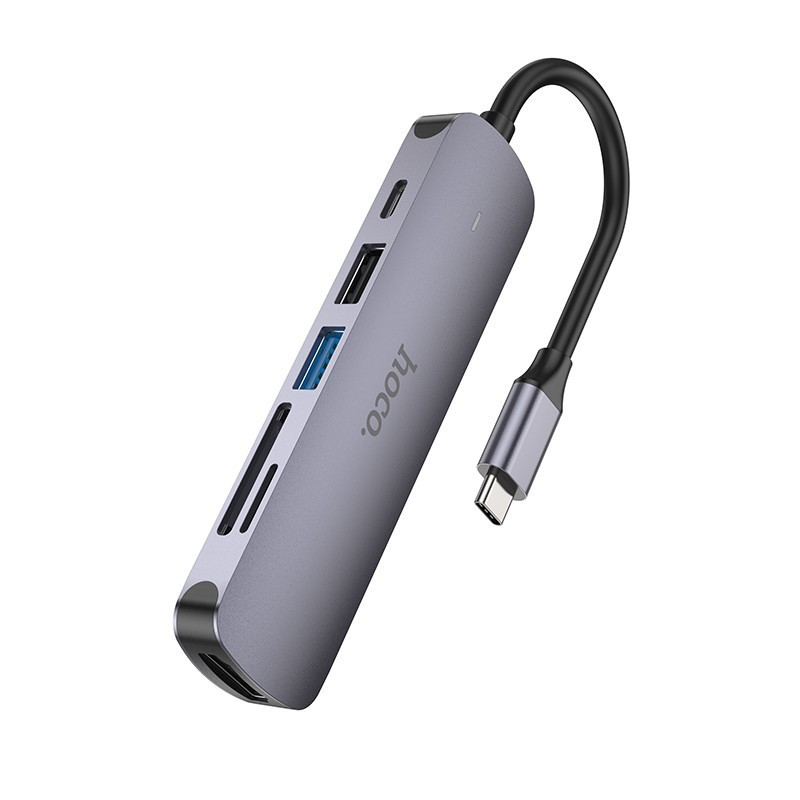 Adapteris Hoco HB28 Type-C Multi-Function Converter HDMI+USB3.0+USB2.0+SD+TF+PD pilkas