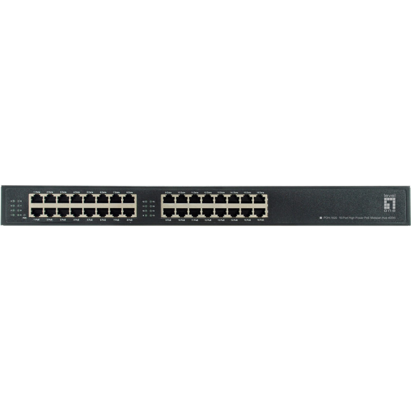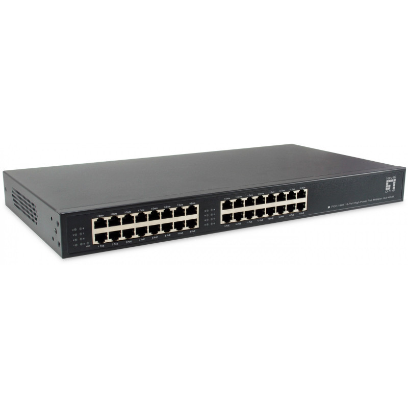 "LevelOne POH-1620 16-Port High Power PoE Midspan Hub ,400W. Ethernet interface type: Fast Ethernet, Gigabit Ethernet, Ethernet LAN data rates: 10,100,1000 Mbit/s, Networking standards: IEEE 802.3, IEEE 802.3ab, IEEE 802.3af, IEEE 802.3u. Product colour: Black, Rack capacity: 1U, LED indicators: Link, PoE, Power. Power consumption (max): 20 W, Power over Ethernet (PoE) power per port: 30 W, Total Power over Ethernet (PoE) budget: 400 W. Width: 440 mm, Depth: 235 mm, Height: 43 mm. Package width: 245 mm, Package depth: 50 mm, Package height: 450 mm"\n"LevelOne POH-1620 16 GE PoE Hub is equipped with 16 RJ-45 ports featuring PoE function to eliminate the bulky power cable need while implementing your network infrastructure thus allowing greater flexibility in the locating of network devices and significantly decreasing installation casts.Easy to Use the compact 19'', IU rack-mountable design enables the switch to be easily located in a server room in order to centralize power management and simplify network integration for various applications. For all the functions featured in POH-1620 users can get the benefits of flexible network solutions that can simplify the installation of wireless access points, IP cameras, IP phone and other devices or applications in the network.