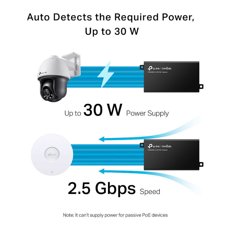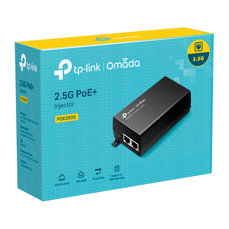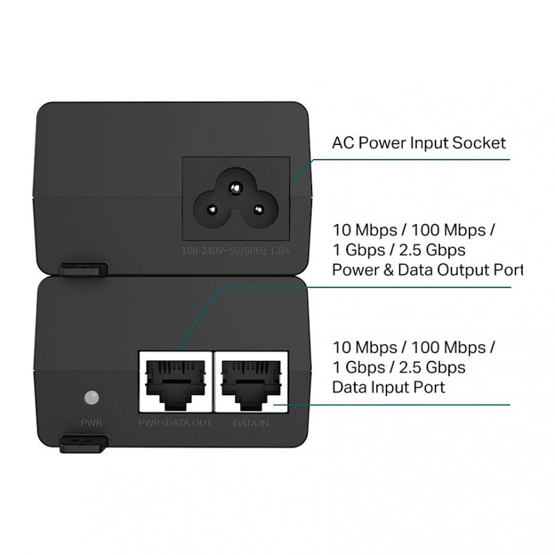 The 2.5G PoE+ Injector POE260S (TL-POE260S) fully complies with IEEE 802.3af/at standards, and can work with all IEEE 802.3af/at PoE compliant PDs (Powered Devices) or other equivalent products, to expand your network to where there are no power line or outlet, where you wish to fix device such as 2.5G AP, HD IP Camera or IP Phone, etc.