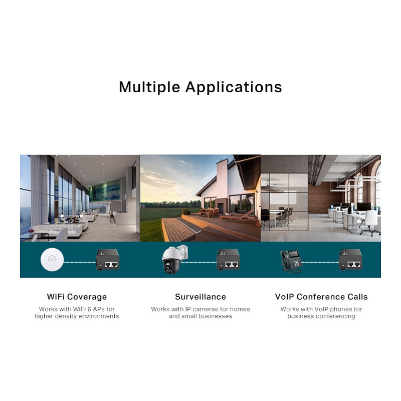 "TP-Link Omada 2.5G PoE+ Injector Adapter. Ethernet interface type: 2.5 Gigabit Ethernet, Fast Ethernet, Gigabit Ethernet, Ethernet LAN data rates: 10,100,1000,2500 Mbit/s, Networking standards: IEEE 802.3ab, IEEE 802.3af, IEEE 802.3at, IEEE 802.3bz, IEEE 802.3i, IEEE 802.3u. Product colour: Black, Maximum operating distance: 100 m. Output power: 30 W, AC adapter input voltage: 100 - 240 V, AC adapter frequency: 50/60 Hz. Certification: FCC, CE, RoHS. Width: 125 mm, Depth: 59.4 mm, Height: 36.8 mm"\n"What This Product Does