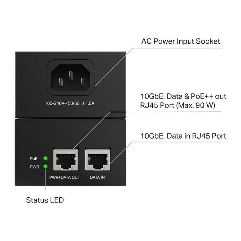 "TP-Link Omada PoE++ Injector. Ethernet interface type: 10 Gigabit Ethernet, Ethernet LAN data rates: 10,100,2500,10000 Mbit/s, Cabling technology: 1000/10000. Product colour: Black, LED indicators: PoE, Power. AC adapter input voltage: 100 - 240 V, AC adapter frequency: 50 - 60 Hz, Input current: 1.6 A. Compliance certificates: CE, Federal Communications Commission (FCC), RoHS. Width: 155 mm, Depth: 70 mm, Height: 42 mm"\n"90W 10G PoE++ Injector