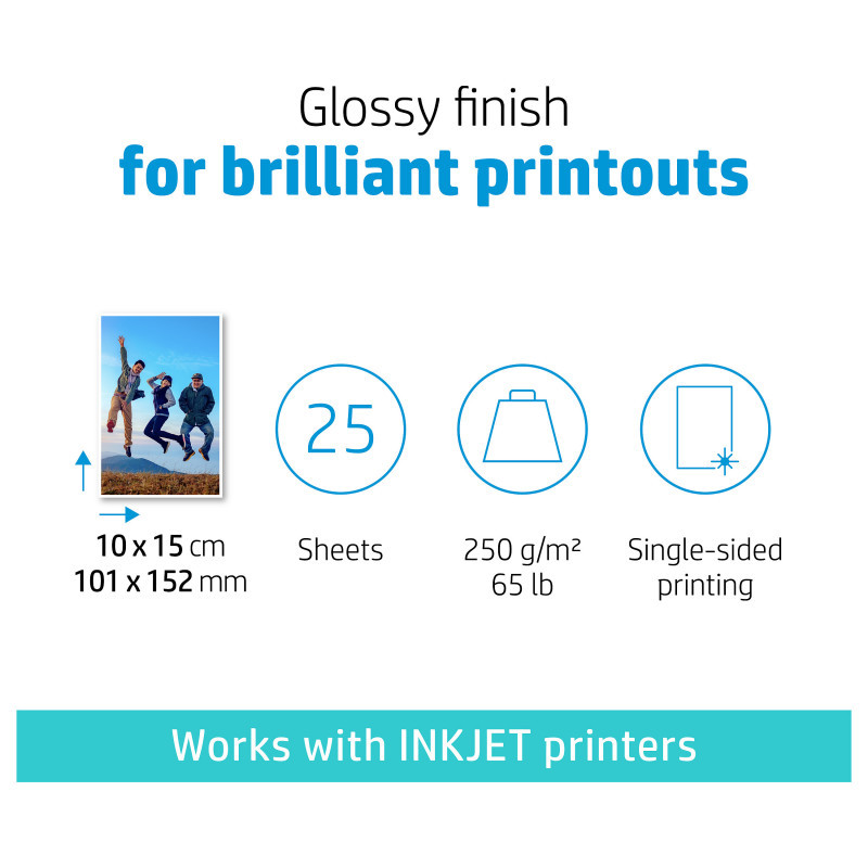 "HP Advanced Photo Paper Glossy 250 g/m2 10 x 15 cm (101 x 152 mm) 25 sheets. Compatible products: Works with inkjet printers, optimized for Original HP Ink. Width: 14.3 mm, Depth: 124 mm, Height: 181 mm. Quantity per pack: 1 pc(s), Package width: 182 mm, Package depth: 124 mm. Pallet gross weight: 119 kg, Master (outer) cases per pallet: 56 pc(s), Layers per pallet: 2 pc(s). Country of origin: China, Germany"\n"Ideal for inkjet printer users and HP Inkjet printer owners printing high-quality, true-to-life photos for scrapbooking, photo albums, and framing.