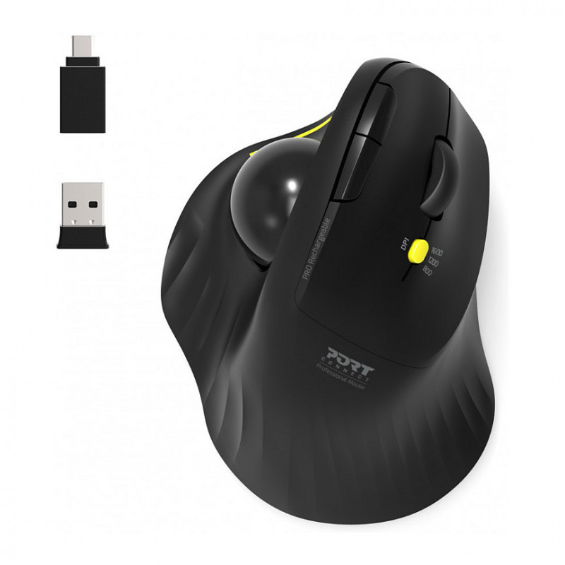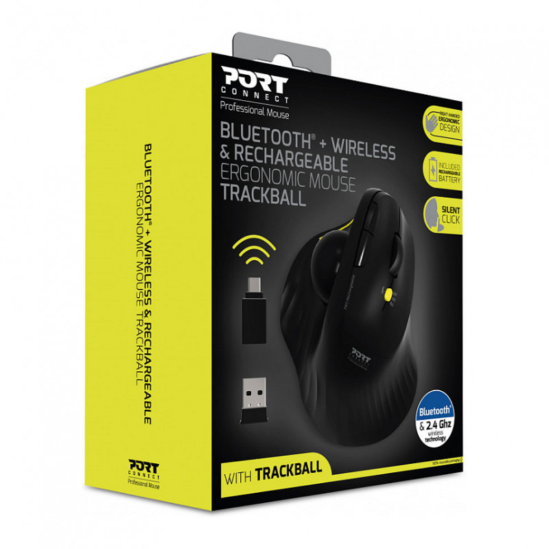 "Port Designs 900719. Form factor: Right-hand. Movement detection technology: Optical, Device interface: RF Wireless + Bluetooth, Movement resolution: 1600 DPI, Buttons type: Pressed buttons, Buttons quantity: 5, Scroll type: Trackball/Wheel. Power source: Batteries. Product colour: Black"\n"AN ERGONOMIC MOUSE