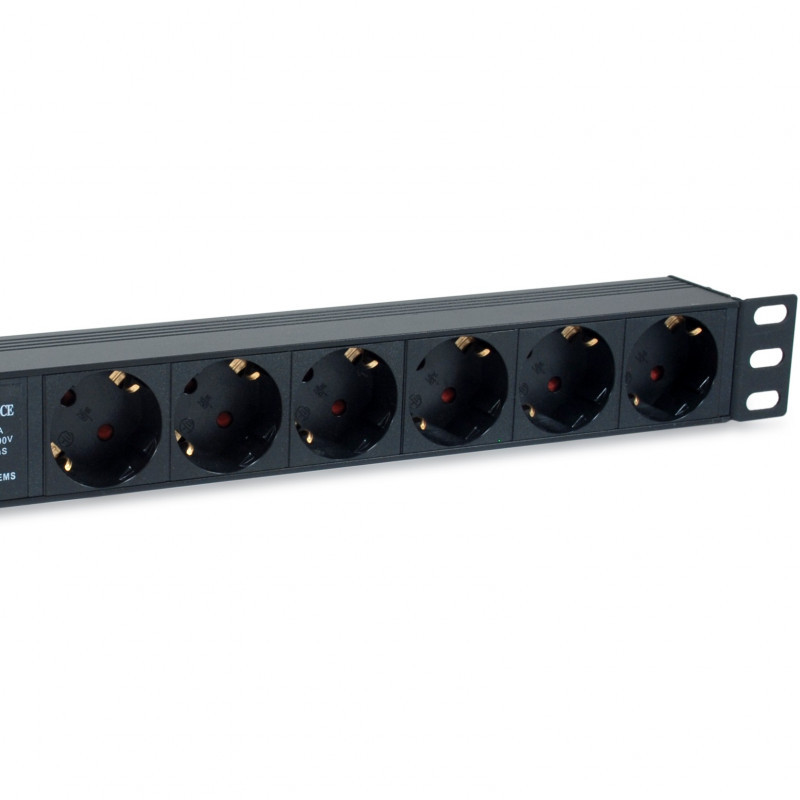"Equip 6-Outlet German Power Distribution Unit, with Surge Protection, Integrated line fitler. Rack capacity: 1U, Housing material: Aluminium. AC outlets quantity: 6 AC outlet(s), AC outlet types: Type F, Power plug: Type F. Cable length: 1.8 m. Nominal input voltage: 220 - 240 V, Maximum current: 16 A, AC input frequency: 50/60 Hz. Compliance certificates: CE, RoHS"\n"The Equip power distribution unit is a high-quality and robust product that was developed for the supply of power in data cabinets and ensures safety with its integrated surge protection. The power strip is carefully tested to ensure functionality and reliability. A 1.8m long supply cable and a built-in on/off switch complete the functionality of this power distribution unit. The optimized design also makes it easy to install. The ideal choice for 19"" cabinet system installation."