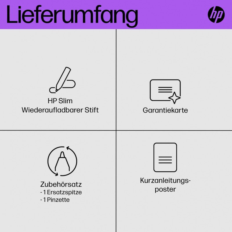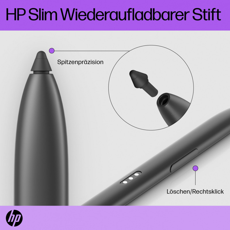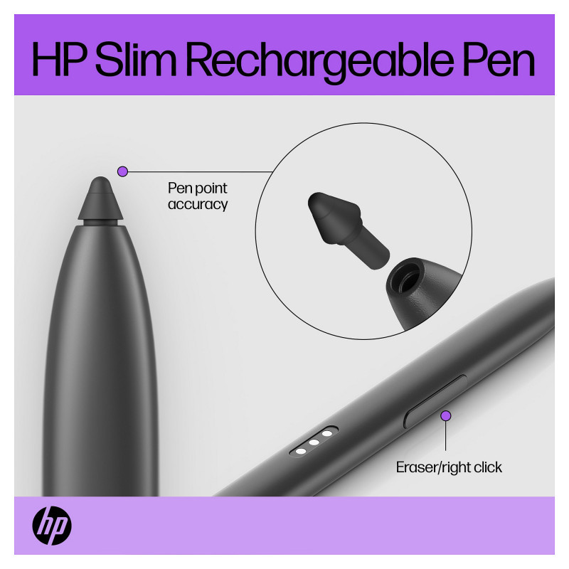 "HP Slim Rechargeable Pen. Brand compatibility: HP, Product colour: Grey, Battery type: Built-in. Weight: 13.9 g, Width: 133.6 mm, Depth: 7 mm. Package depth: 13.9 mm"\n"Powerful Pen for select HP ProBooks[1]