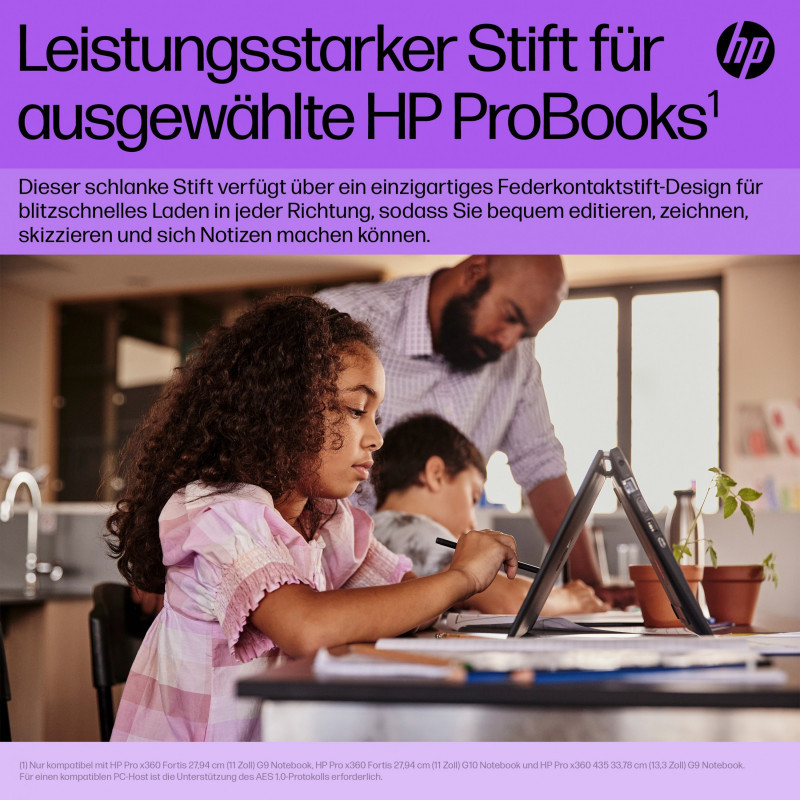 Compatible only with select education edition HP ProBook's[1], this sleek pen includes a unique pogo-pin design for fast, any direction charging so you can edit, draw, doodle, and take notes just like using a traditional pen and paper, but smarter. Plus, with its stylish design, you can take it anywhere."