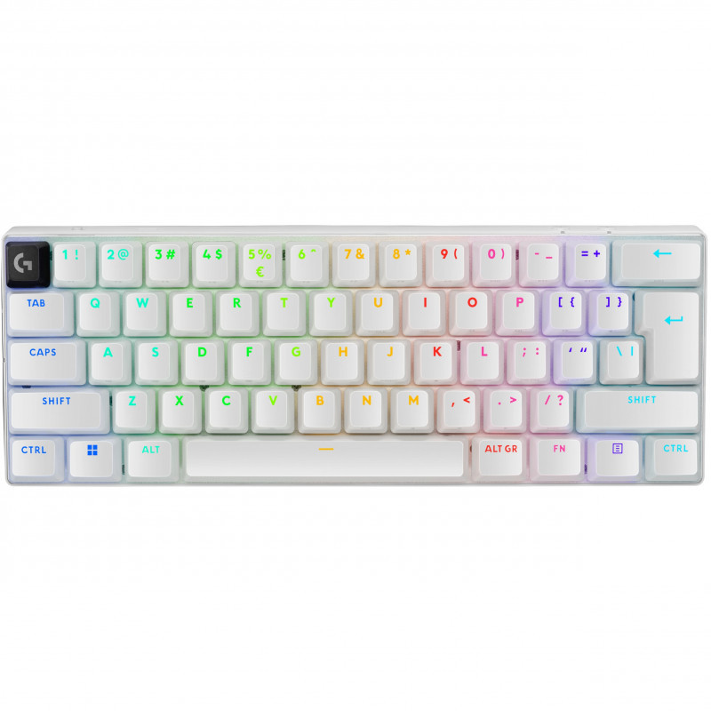 "Logitech G 920-011930. Keyboard form factor: 60%. Keyboard style: Straight. Connectivity technology: Wired & Wireless, Device interface: USB + RF Wireless + Bluetooth, Keyboard key switch: Mechanical, Keyboard layout: QWERTY. Backlight type: RGB LED. Cable length: 1.8 m. Recommended usage: Gaming. Product colour: White"\n
