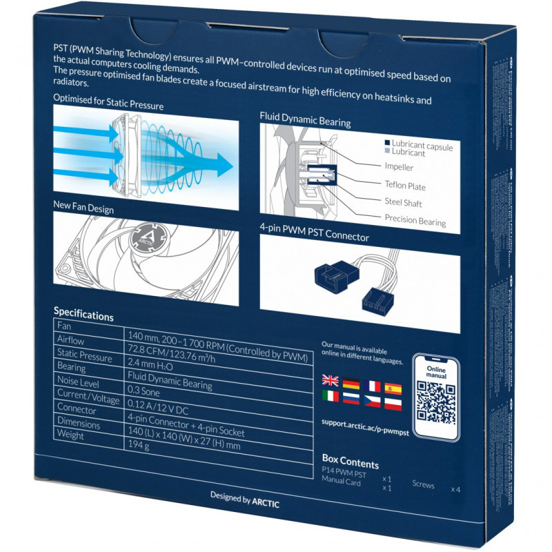 "ARCTIC P14 PWM PST Pressure-optimised 140 mm Fan with PWM PST. Type: Fan, Fan diameter: 14 cm, Rotational speed (min): 200 RPM, Rotational speed (max): 1700 RPM, Noise level: 0.3 sone, Airflow: 123.69 m³/h, Maximum air pressure: 2.4 mmH2O, Bearing type: Fluid Dynamic Bearing (FDB). Voltage: 12 V. Width: 140 mm, Depth: 140 mm, Height: 27 mm. Product colour: White"\n"ARCTIC’s versatile assortment of PC fans are both quiet and powerful. We have the right options for any application or need, in sizes from 80 to 140 mm. Plus, our case fans are equipped with state-of-the-art engine technology, innovative fan blades and high quality bearings, making them particularly durable and efficient."